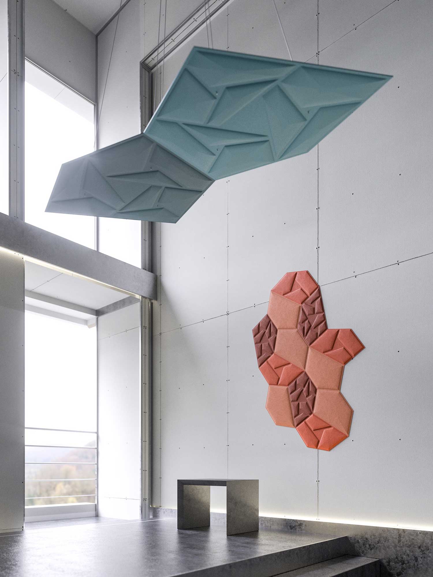 Nachhaltig, extrem langlebig und als frei hängendes Akustikelement konstruiert, bietet sie im Vergleich zu herkömmlichen Wandpaneelen die doppelte schallabsorbierende Fläche – ideal zur effektiven Reduktion von Störgeräuschen in verschiedensten Einsatzbereichen. Gleichzeitig fungiert sie als innovatives Interior-Element für anspruchsvolle Architekturprojekte.