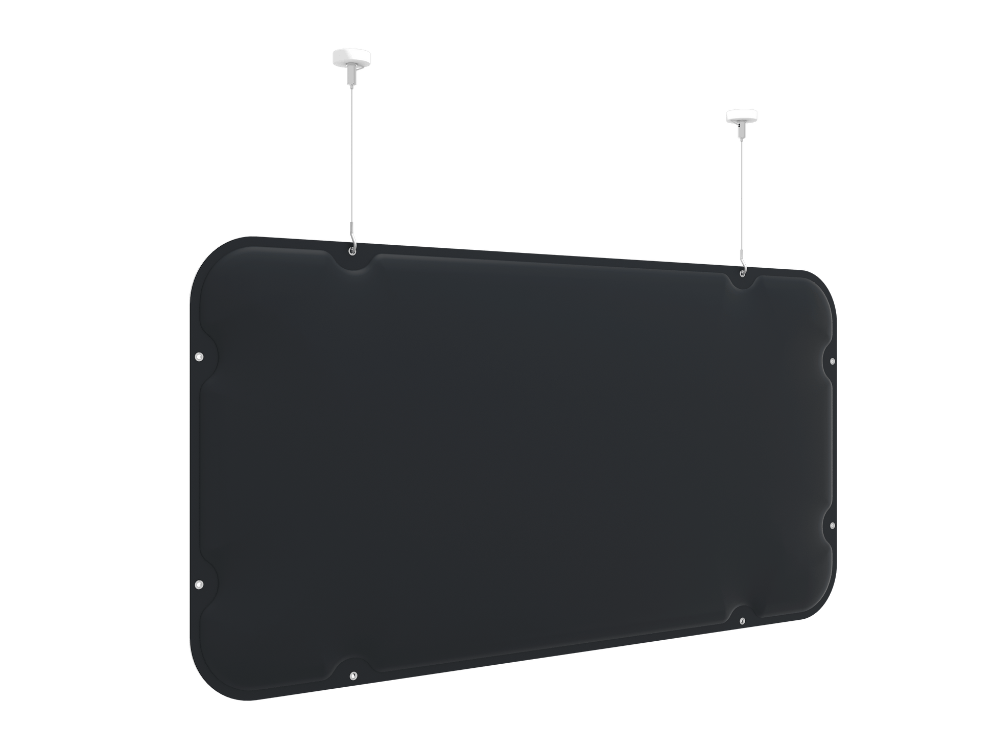 Als frei hängendes Akustikelement bietet es im Vergleich zu herkömmlichen Paneelen die doppelte absorbierende Oberfläche und ist damit eine besonders effiziente Lösung zur Reduzierung von Nachhall – ideal für große öffentliche oder industrielle Räume.