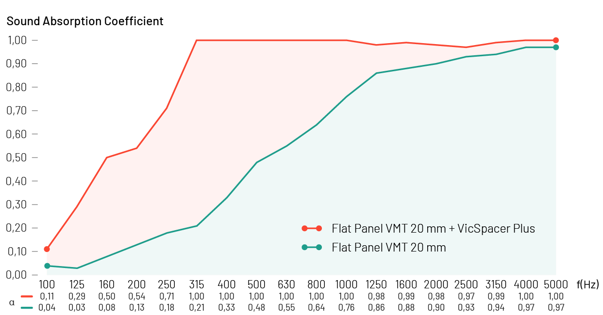 Durch die zusätzliche PET-Lage wird die Schallabsorption deutlich erhöht – ideal für besonders anspruchsvolle akustische Umgebungen. Dabei bleibt VicSpacer eine nachhaltige Lösung, da das Material überwiegend aus recyceltem Kunststoff besteht.