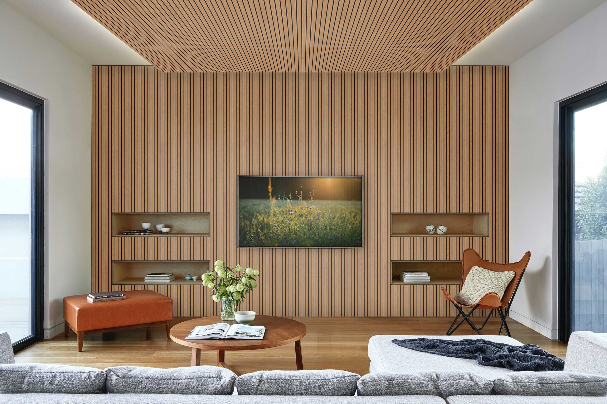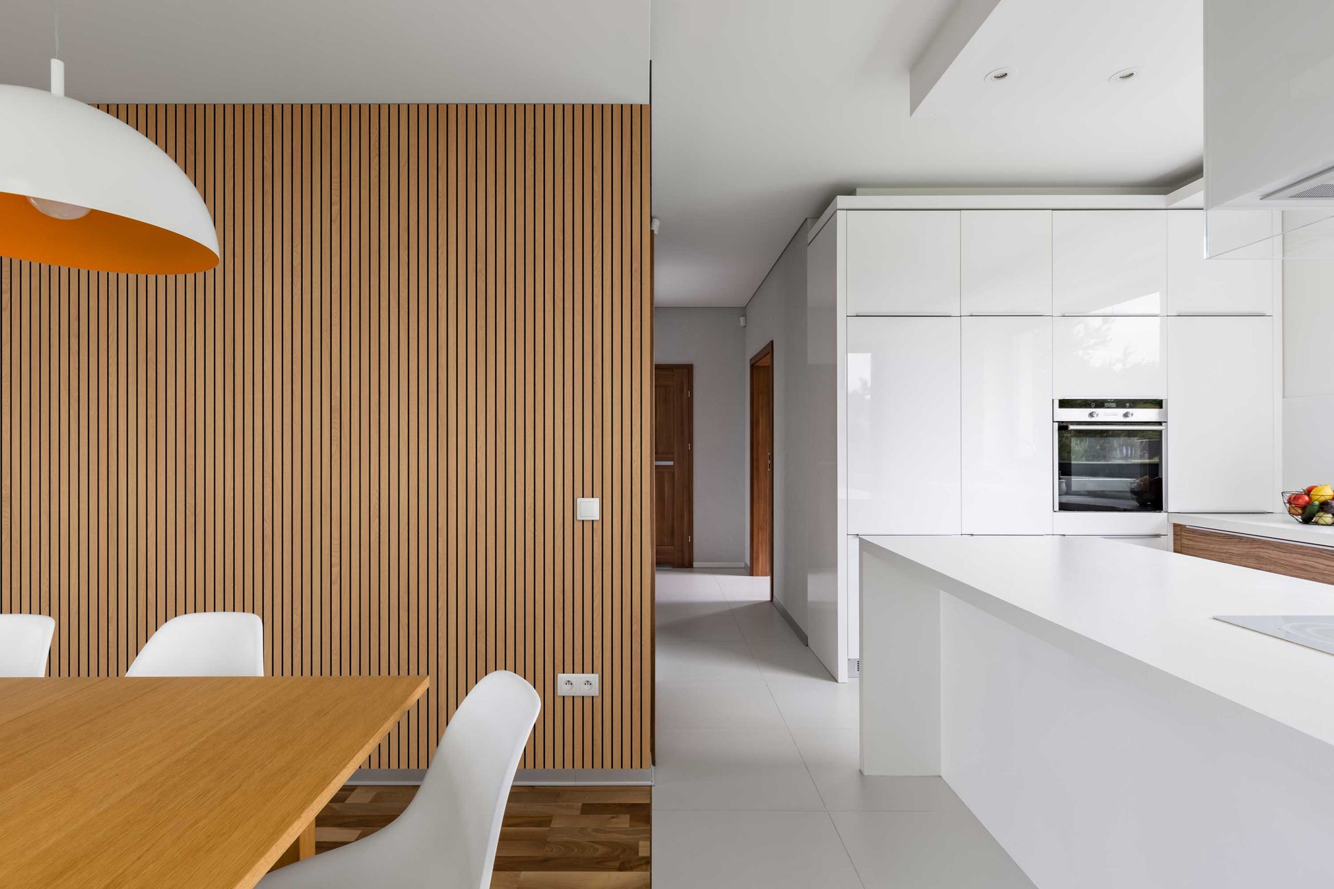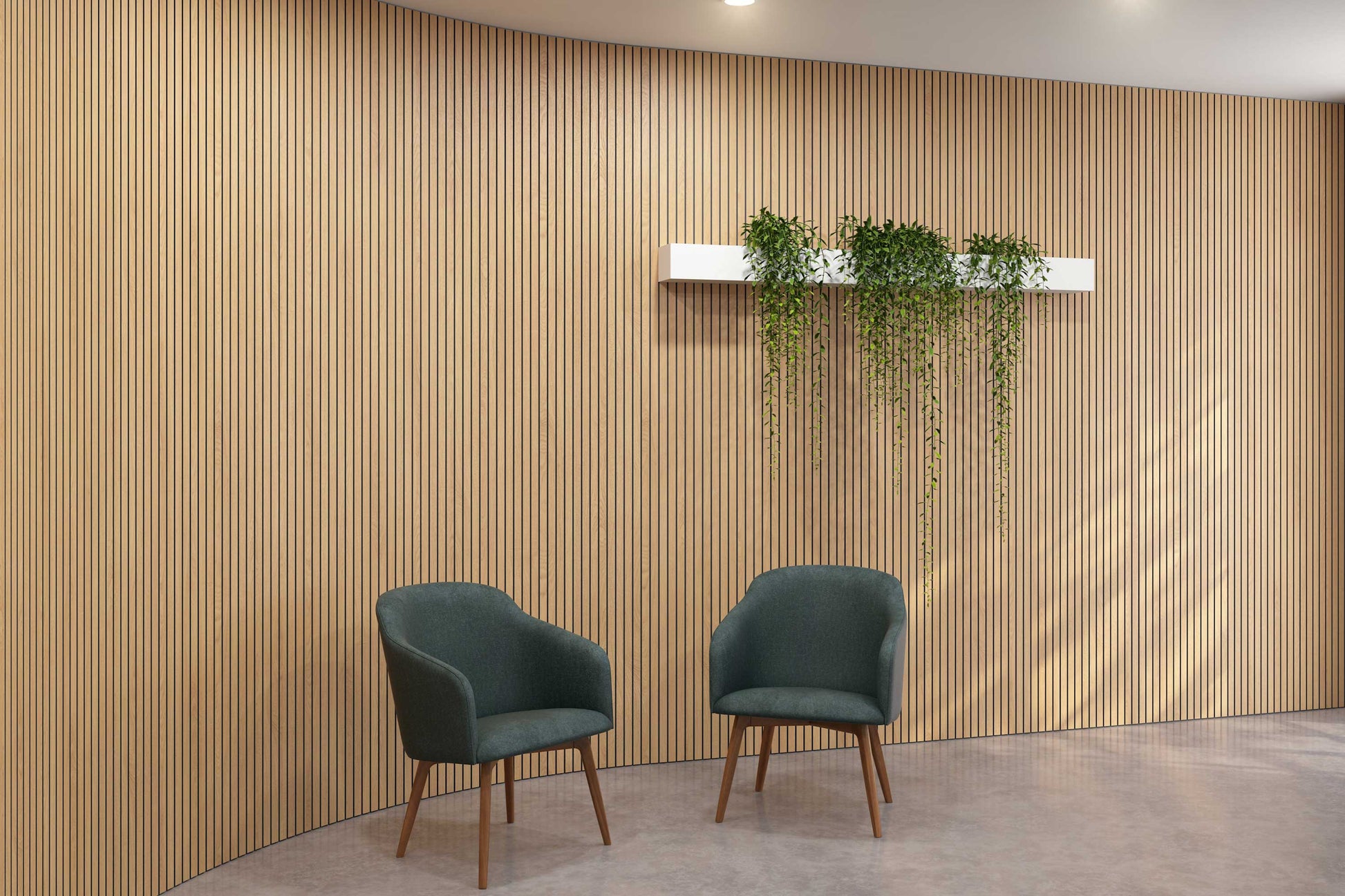 Das Design orientiert sich an modernen, dekorativen Holzlamellen und bietet eine ästhetisch anspruchsvolle Lösung zur Schallreduktion – ideal für Büros, Restaurants, Hotels oder Wohnräume, die akustisch optimiert und gestalterisch aufgewertet werden sollen.