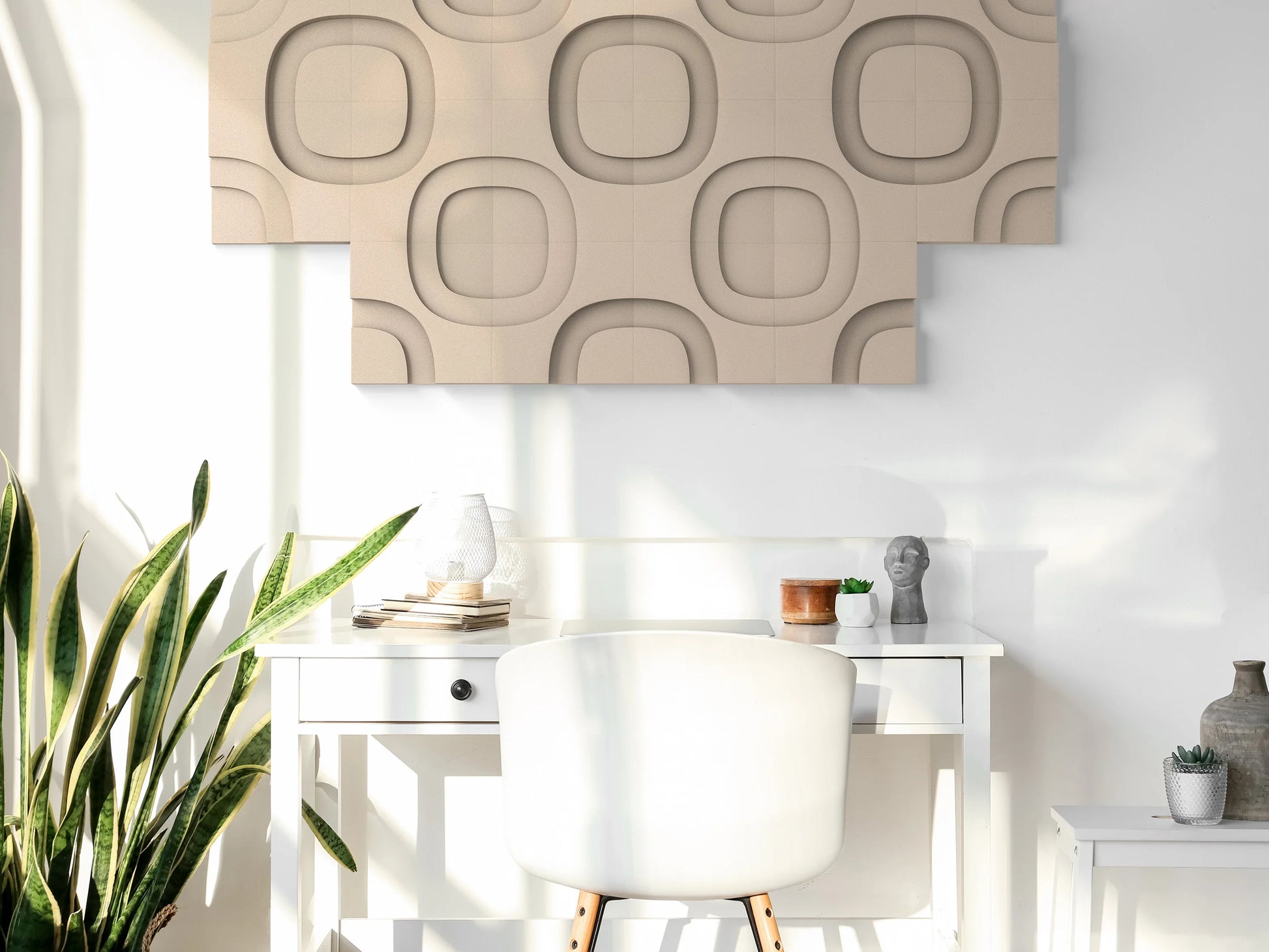 Die Akustikpaneele bestehen aus vier identischen, modular kombinierbaren Formen, die vielseitige Gestaltungsmöglichkeiten bieten. Ihr geometrisches, retro-inspiriertes Design vereint Ästhetik und Funktion – ideal für Büros, Hotels, Restaurants und anspruchsvolle Wohnräume.