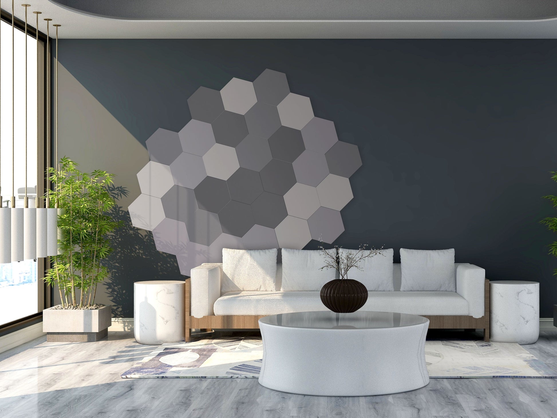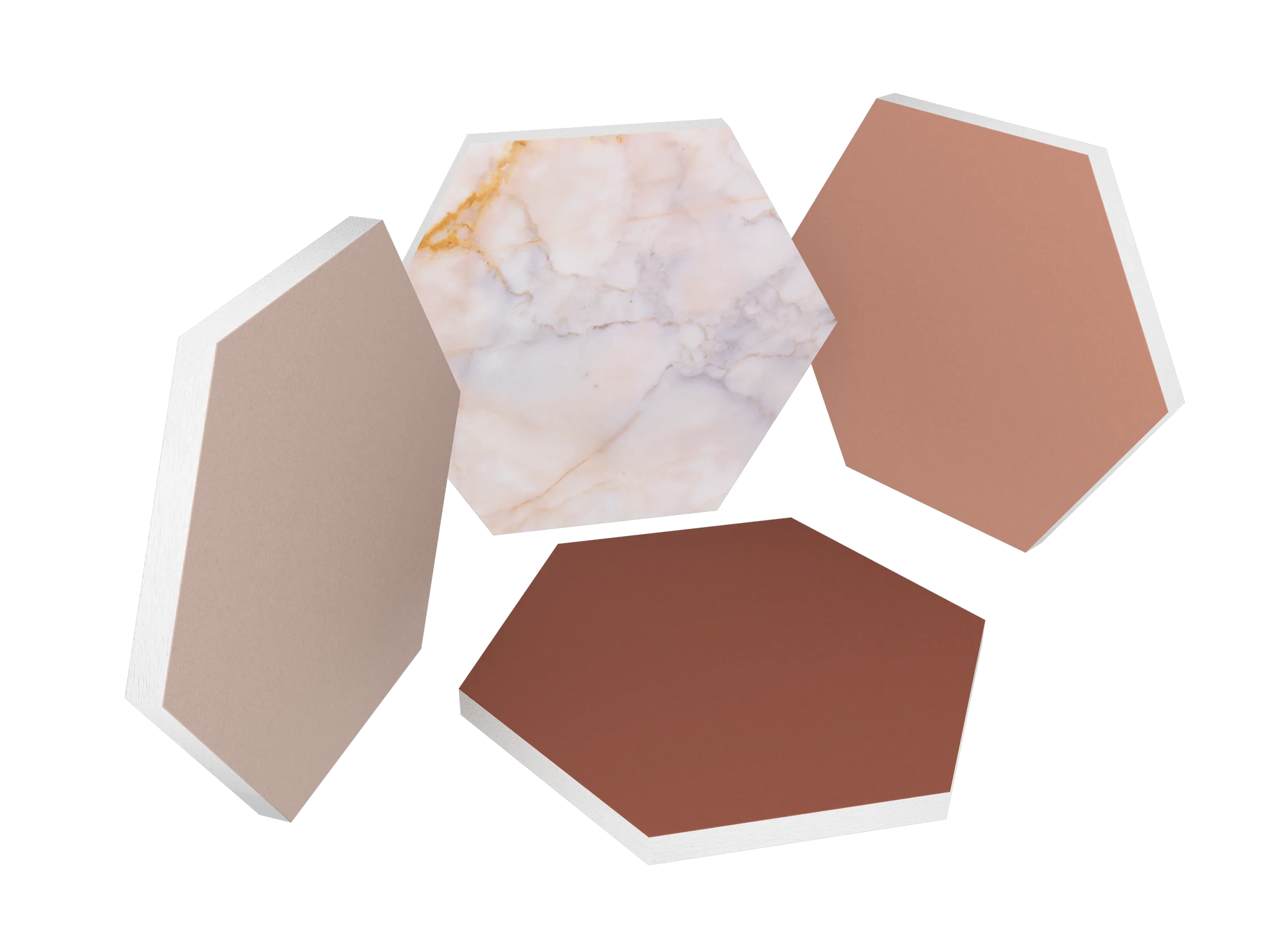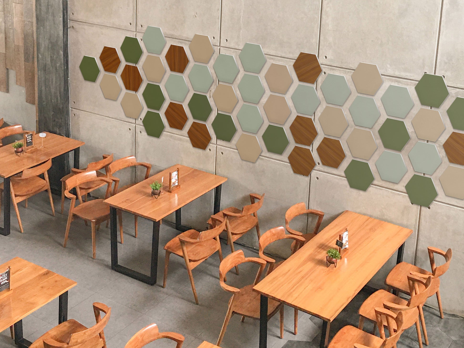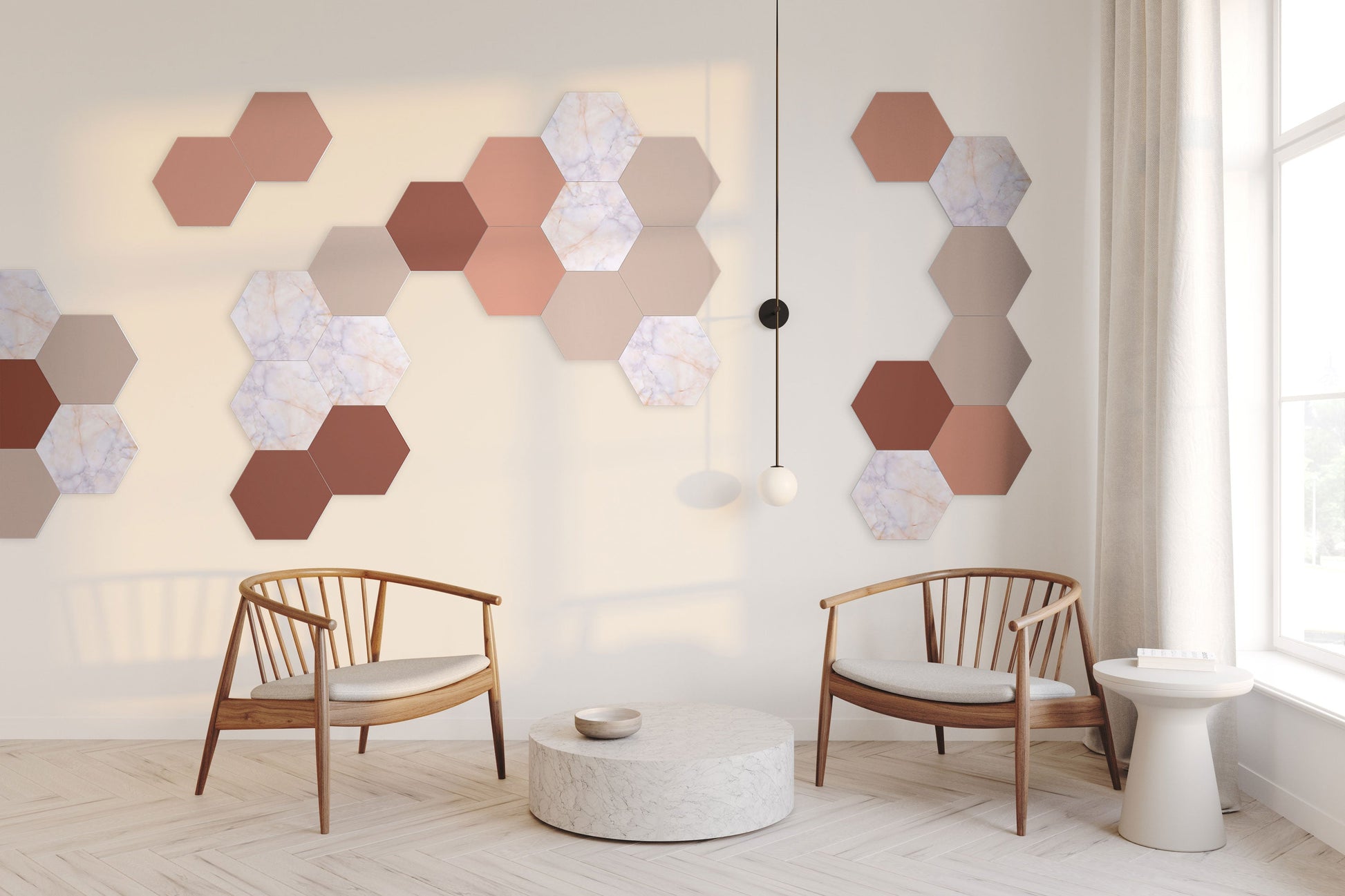 Hexagonale Akustikpaneel-Kollektionen in 4 Farben oder Dekoren